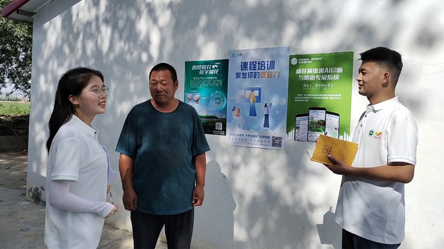 棉田调研结束后,实践团成员通过张贴海报、播放短视频、口头宣讲等形式,向棉农科普人工智能(AI)技术及其在农业中的应用,并介绍“棉医生”APP的功能和操作步骤,积极倡导“用科技改变棉花生产”,使棉农了解AI、使用AI、感受AI。在实践团成员的指导下,棉农在智能手机上体验了APP的棉花病虫害知识问答功能。“现在的科技发展太快了,我们以前要靠自己或者其他老农户的经验来选择农药和施药量,一般都是看感觉,没有精确的概念。现在,在手机上就能得到专业的病虫害防治意见,真的是太方便了!”棉农谢海滨激动地说。