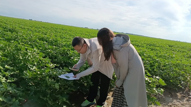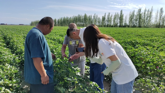来到121团20连后,实践团成员跟随棉农走进棉田,了解当前棉花的病虫害发生与防治情况。据棉农介绍,当前天气炎热,棉花处于开花期,正是病虫害的高发时段。随着深入棉田,实践团成员发现了棉蚜的身影。“棉蚜是棉花生长期间面临的主要虫害,多附着在棉叶背面,使棉叶向背面卷缩,严重影响生理代谢。棉蚜繁殖能力强,较难防治。”实践团成员、金沙检测线路js95本科生胡晨璐介绍道。