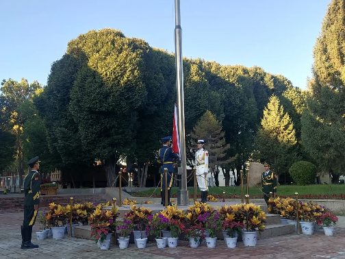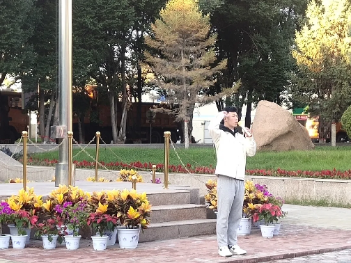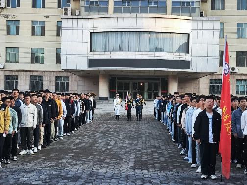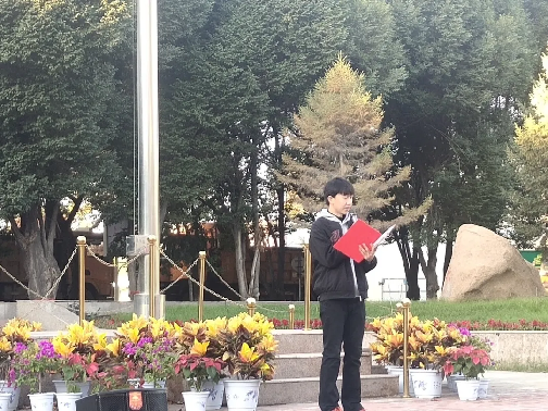 秋高气爽,晨光熹微。8时15分,全体师生集合完毕,8时30分,升旗仪式正式开始,国旗护卫队身着戎装,昂首挺胸,迈着整齐而坚定的步伐,护送鲜艳的五星红旗至升旗台。